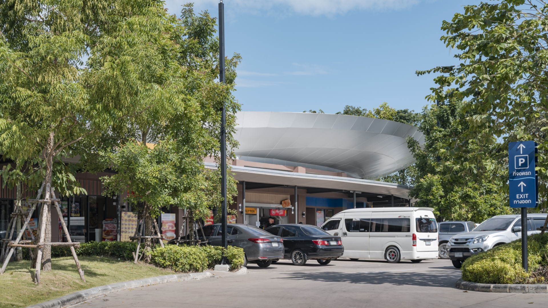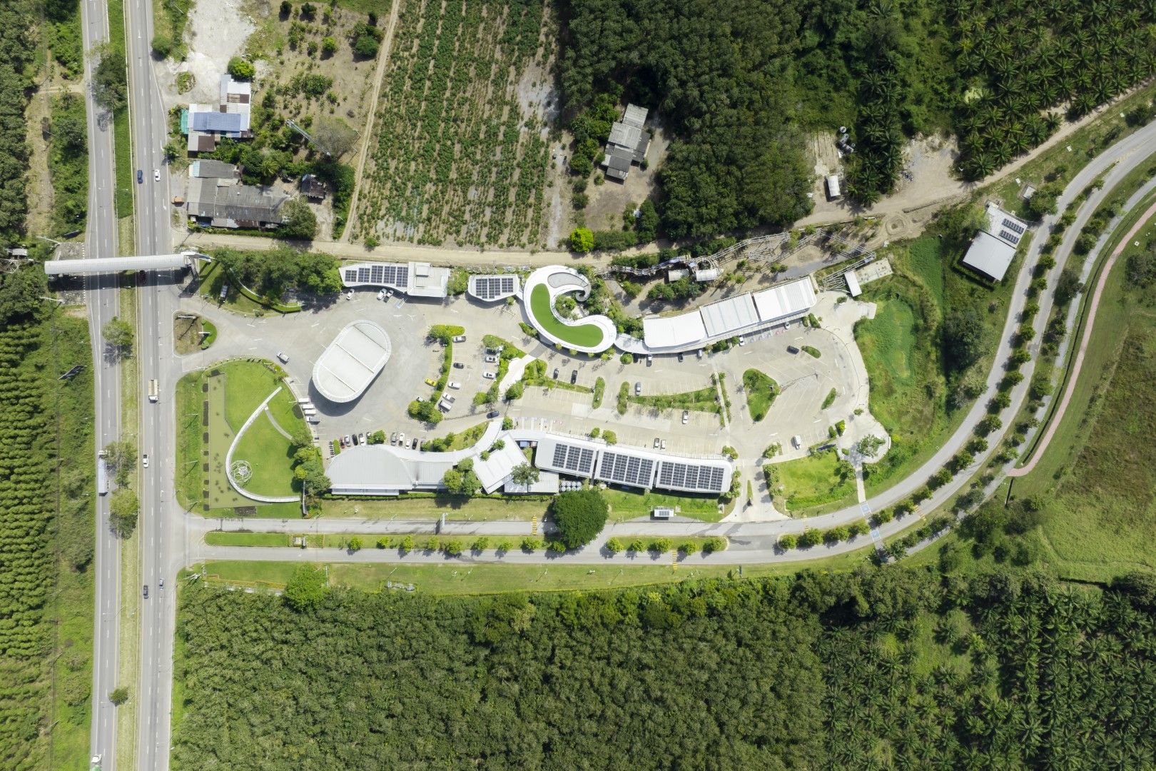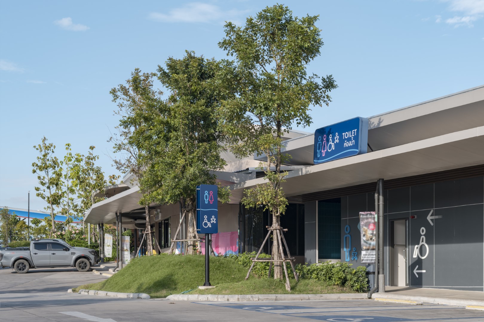 Master planning enables vehicles to view storefronts and park directly at shops. Covered walkways connect parking to retail along sloped paths with ramped access accommodating wheelchair users throughout. Centrally located bus drop-offs and rear parking encourage visitor activities. Natural drainage channels terraced through the project direct water to retention ponds which double as VISTEC mountain viewpoints.