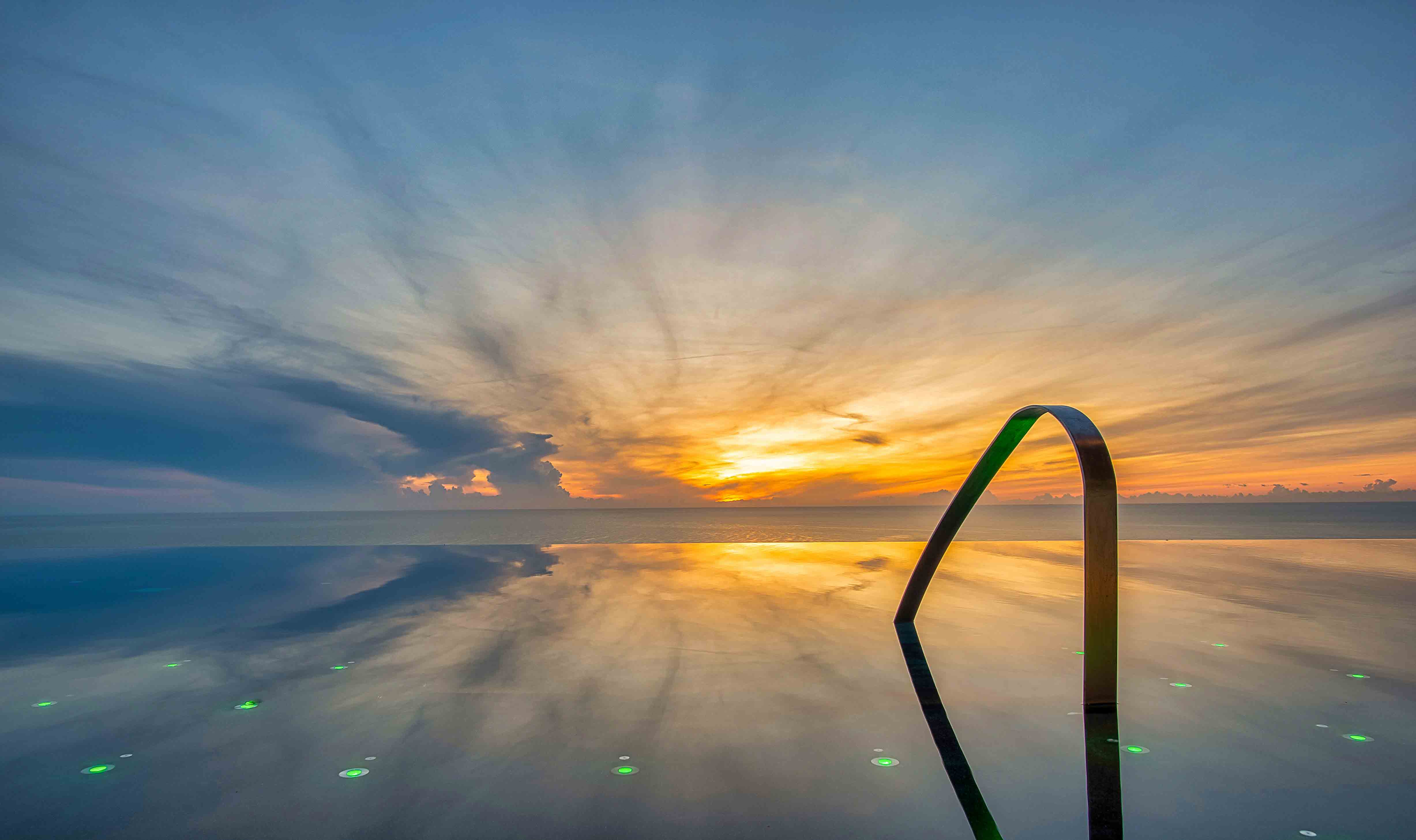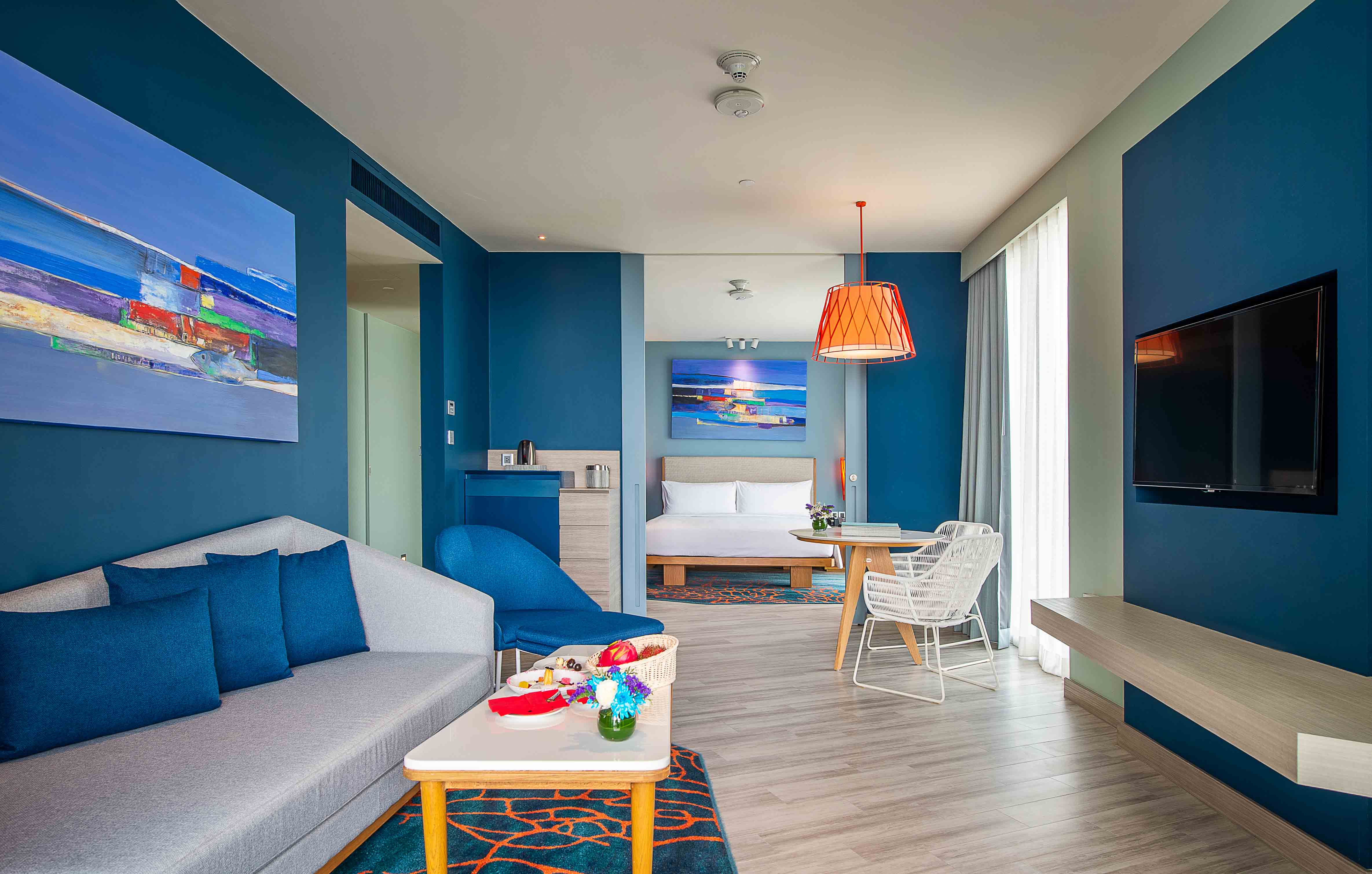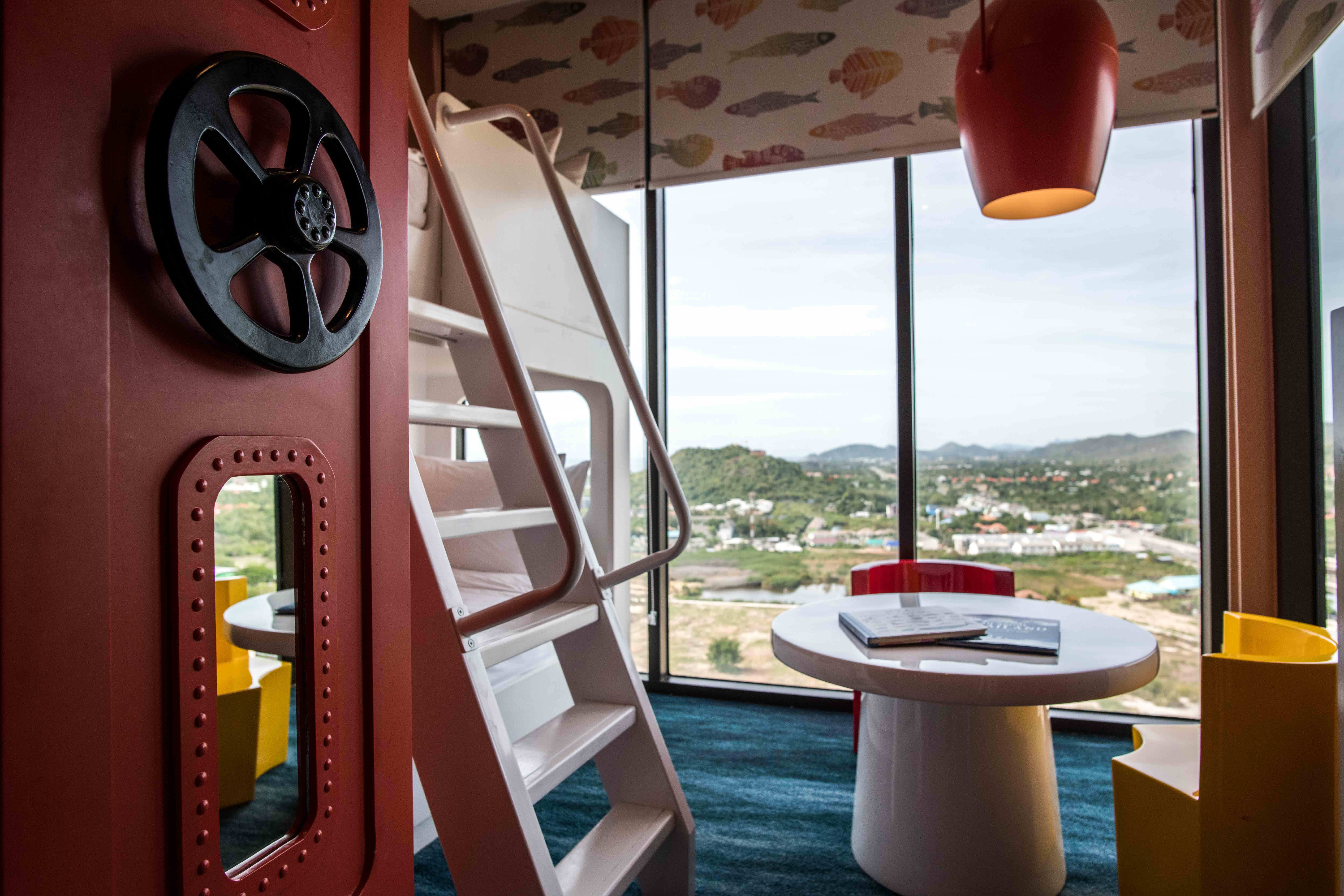 The design concept was to position the common areas to provide optimum views of the ocean and surrounding mountains. A rooftop Infinity Edge pool is the highlight of the building. This is connected to the Sky Bar which has both indoor and outdoor seating was well as a glass-bottomed terrace. 80% of guest rooms have views of the water park, Hua Hin town and the ocean in the distance, all the way down the coast to Kao Tao. Each room boasts a large balcony which is open to the sea breeze.