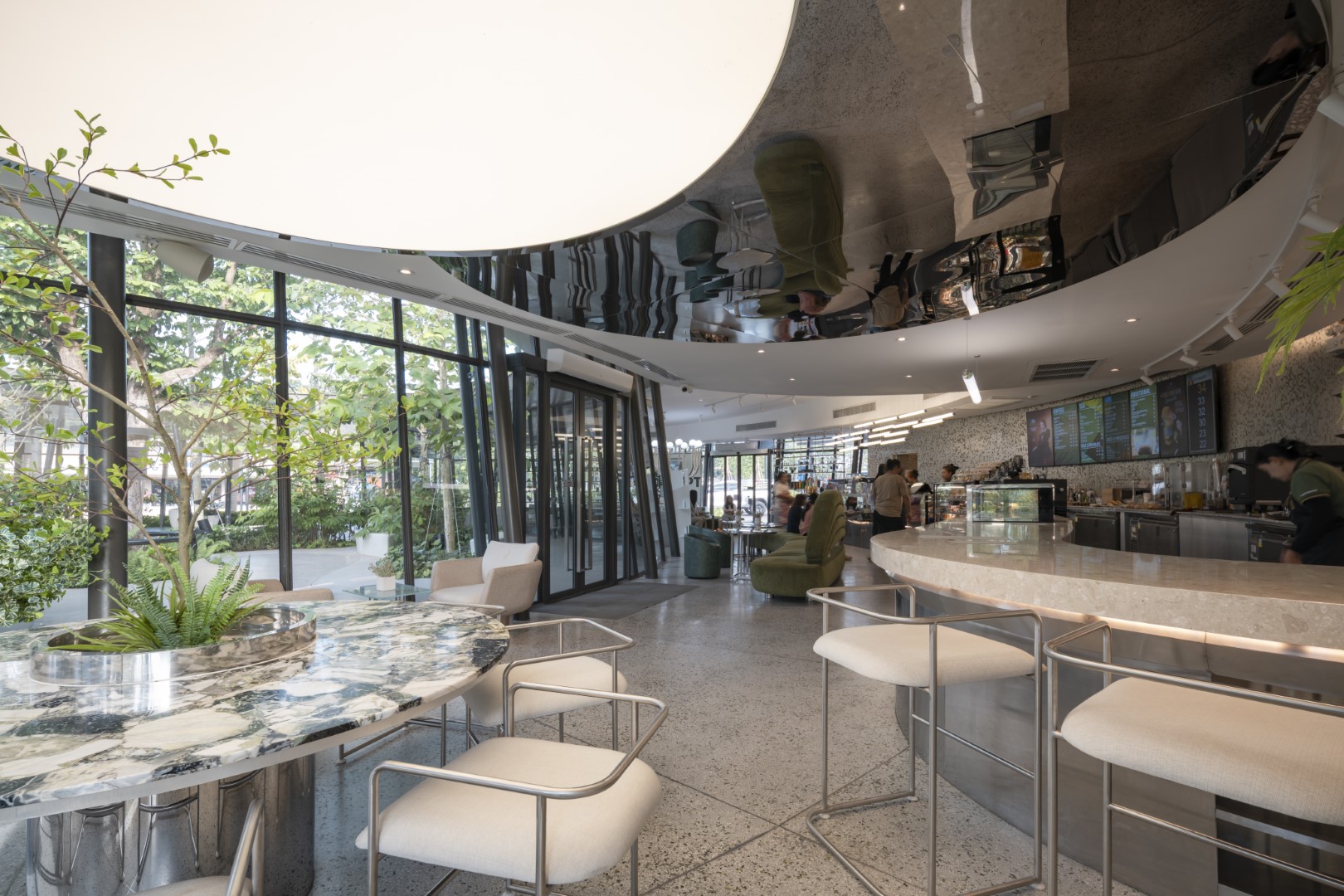 The Amazon concept store features flowing forms with gardens connecting indoor-outdoor zones via the Jungle Trail and rooftop access. Perimeter steel columns eliminate central obstructions, while flat slab concrete roofing achieves thin canopy edges and desired slopes.