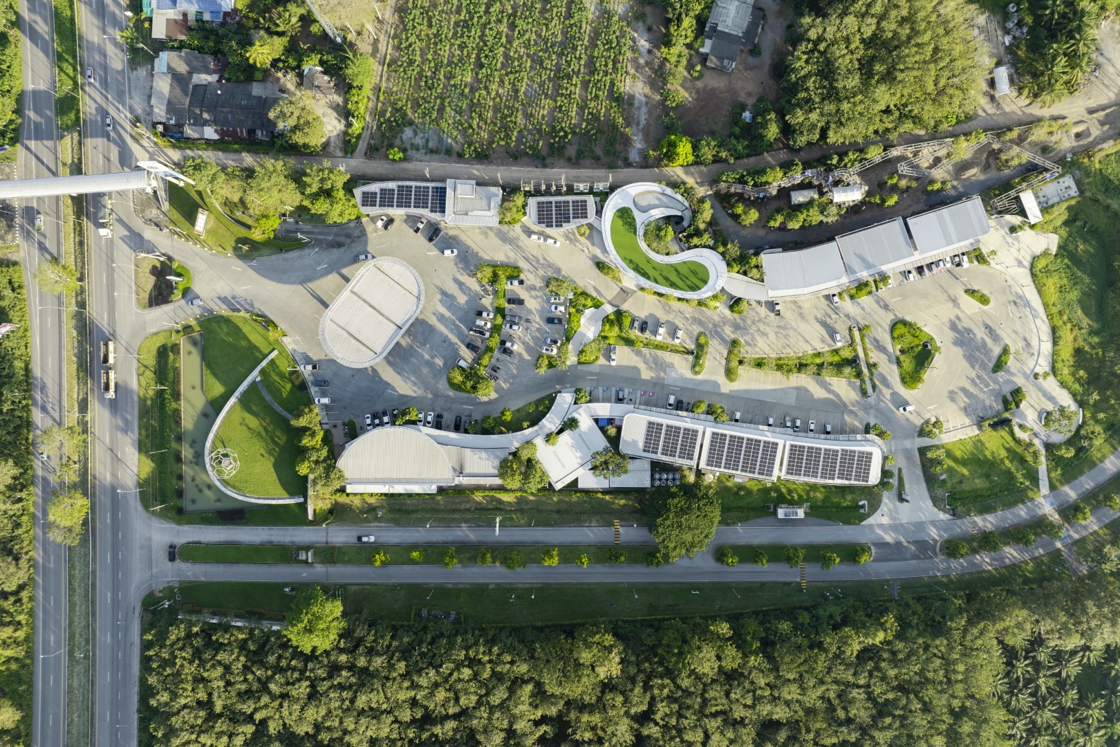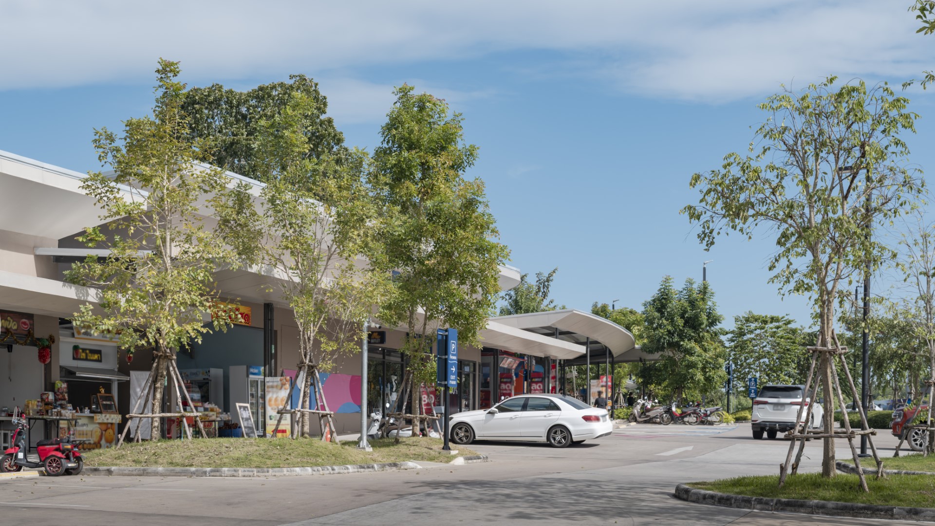 Master planning enables vehicles to view storefronts and park directly at shops. Covered walkways connect parking to retail along sloped paths with ramped access accommodating wheelchair users throughout. Centrally located bus drop-offs and rear parking encourage visitor activities. Natural drainage channels terraced through the project direct water to retention ponds which double as VISTEC mountain viewpoints.