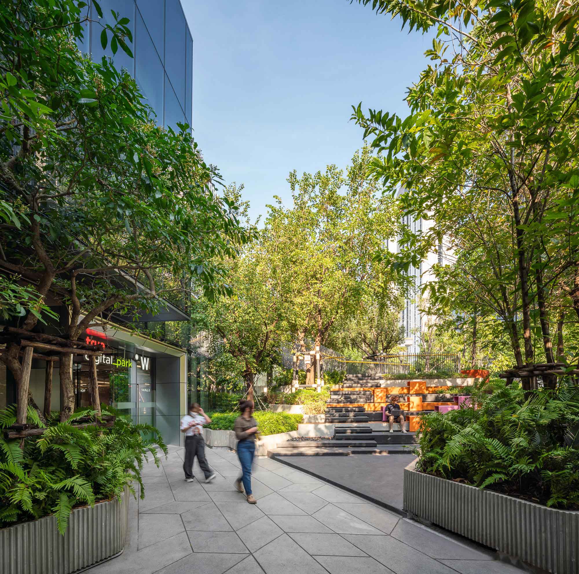 True Digital Park is part of the Bangkok CyberTech District which aims to drive the digital economy crucial to the success of Thailand 4.0 by providing a space for networking and collaboration. True Digital Park West is a mixed-use complex with a total area of 78,000 square meters that includes retail spaces, offices, a convention hall, a jogging track, and a meditation pavilion.